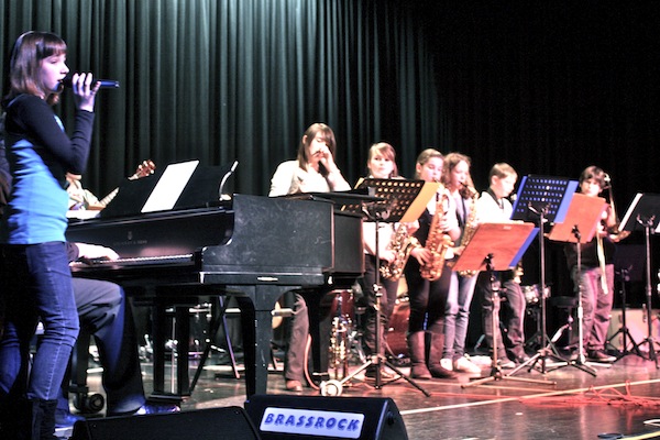 In der Umbaupause und weiteren Pausen spielten Sax5connctions (diesmal zu viert, weil ihr Altist Jens noch krank war). Die Musical AG des Clara-Schumann-Gymnasiums war mit Ausschnitten aus „Chess“ und anderen Musicals zu hören, gefolgt von einem eher kammermusikalischen Jazz- und Popteil. Den Schluß machte die Oberstufenband „Brassrock“ (die muß man nicht mehr vorstellen) und weil unser Schulleiter Peter Wagner im nächsten Jahr in Pension gehen wird, war es für ihn das letzte dienstliche Weihnachtskonzert. Blumen und ein dickes Dankeschön – ohne Peter Wagner gäbe es die Musikabteilung nicht in der jetzigen Form.
