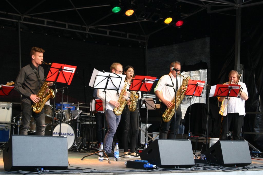 Wir hatten schon öfter beim Marathon gespielt – angefangen an der Schule, als die Strecke dort noch langführte, bis zu Stationen um den Friedensplatz – und so hat sich allmählich auch hier eine Tradition entwickelt. Oliver Gassen hatte uns gefragt, ob wir denn am Vorabend auf dem Münsterplatz spielen könnten und da haben wir zugesagt. Kurzum: tolle Atmosphäre, wir spielten in Bestbesetzung mit Lea, Arnulf, Johannes, Alex und anderen, ich konnte endlich mal wieder Posaune spielen und die geschätzten fünfhundert Leute fanden es ziemlich gut. Oliver war hinterher sehr angetan und fragte, ob wir 2018 beim Zieleinlauf der Schnellsten spielen würden und mehr kann man bei dieser Veranstaltung nicht erreichen. Ja, Oliver. Machen wir!